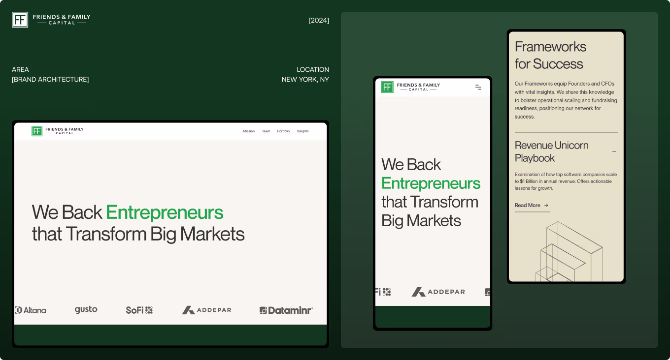 For the Friends & Family Capital website, we focused on creating a polished, modern design that reflects the firm's credibility and forward-thinking vision. Through collaboration and strategic execution, we delivered a platform tailored to their goals.