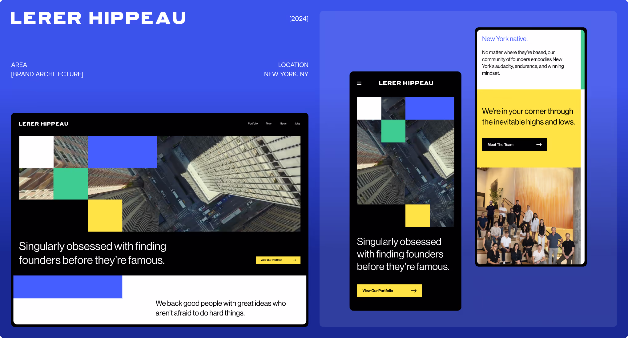 The brand identity for Lerer Hippeau is defined by a modern and cohesive aesthetic, using Neue Haas Grotesk Display Pro for both display and body. This typeface brings clarity and a sense of forward momentum, reflecting the firm’s dynamic approach to investing. The color palette—featuring Blue Ribbon, White, Shamrock, Black, and Ripe Lemon—ensures a bold yet approachable presence. Together, these elements create a balanced visual language that embodies Lerer Hippeau’s mission to champion ambitious founders, bridging innovation and accessibility.