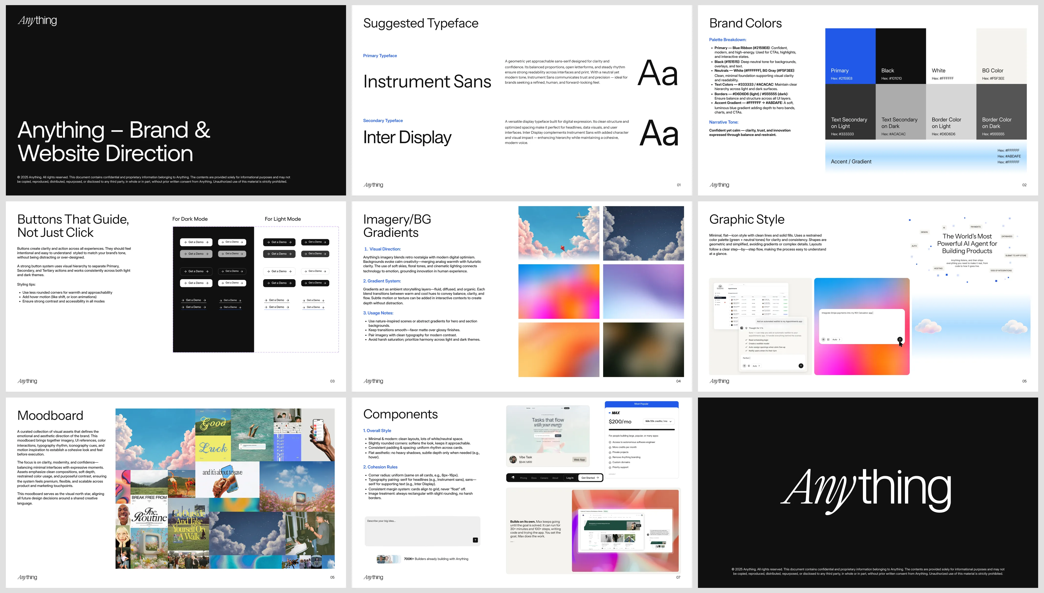 The Anything brand blends nostalgia and modern utility into a calm, expressive system. Soft typography, light color palettes, and gentle motion cues evoke early internet charm while maintaining clarity and polish. The identity reinforces Anything’s mission to make building feel intuitive, creative, and genuinely enjoyable.