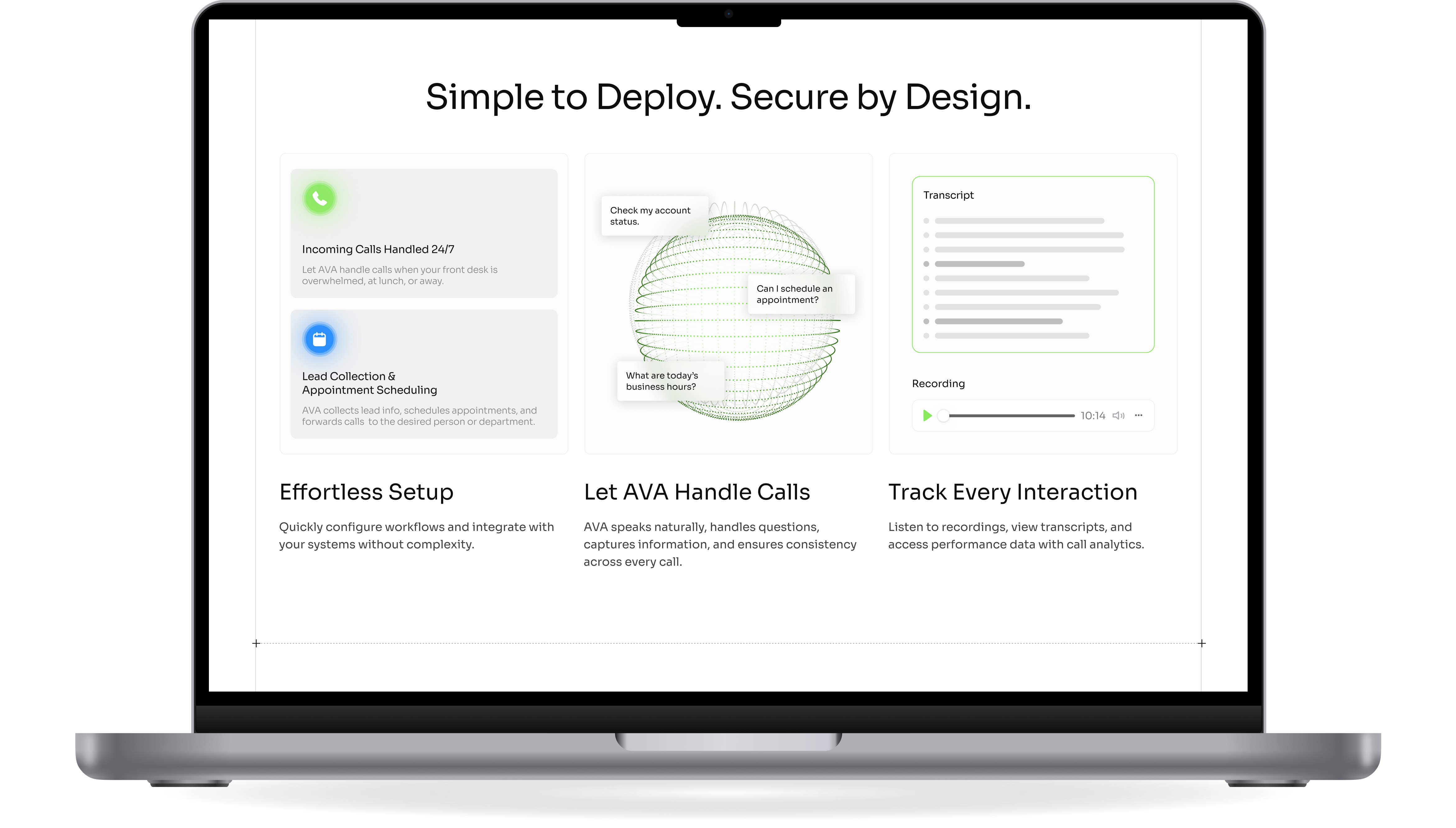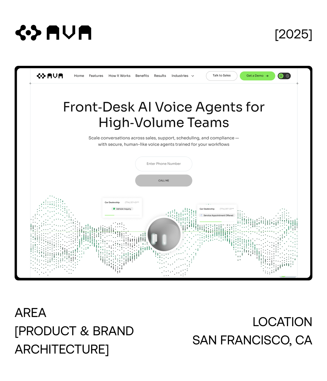 - Product UI & Feature Pages: Each vertical (automotive, healthcare, service, and operations) received tailored storytelling, highlighting AVA’s adaptability to complex enterprise needs.