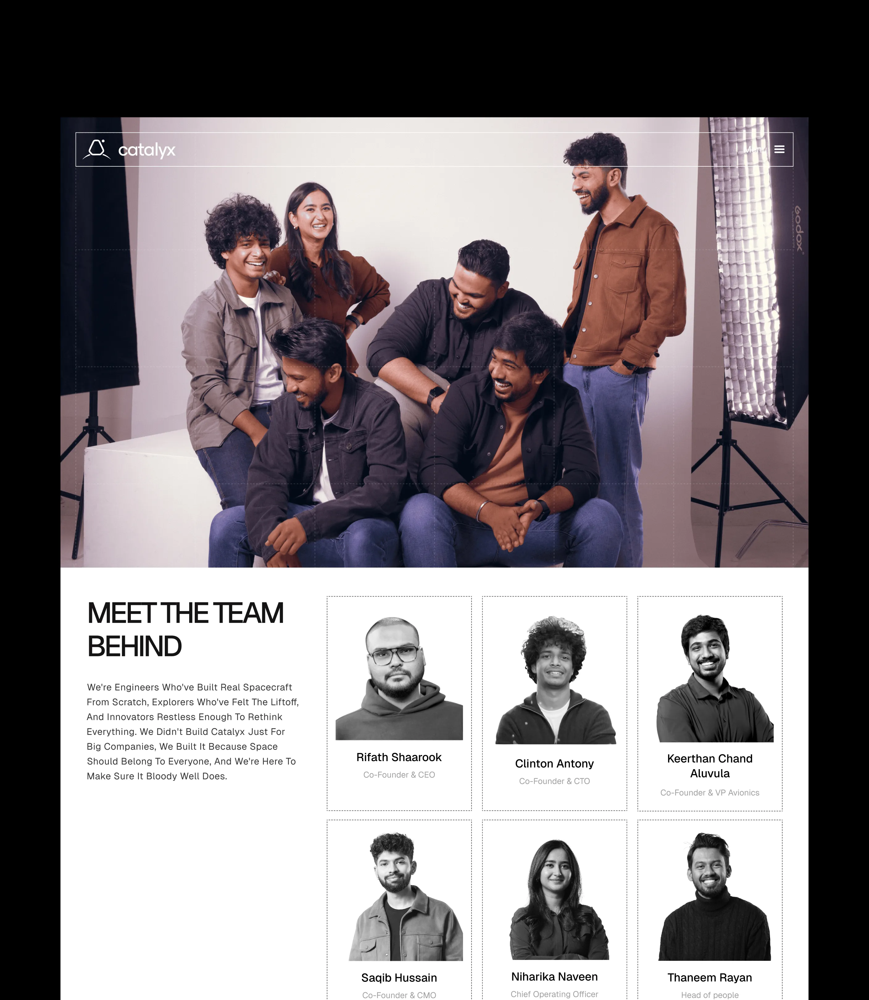 Rather than presenting Catalyx’s team as a static list of roles, we worked closely with the founders to reframe how the people behind the company are introduced. The experience highlights collaboration, shared expertise, and real-world credibility, using photography, layout, and structure to convey who the team is and how they work together. The result is a more human, confident introduction that reinforces trust and reflects the depth of the people building the platform.
