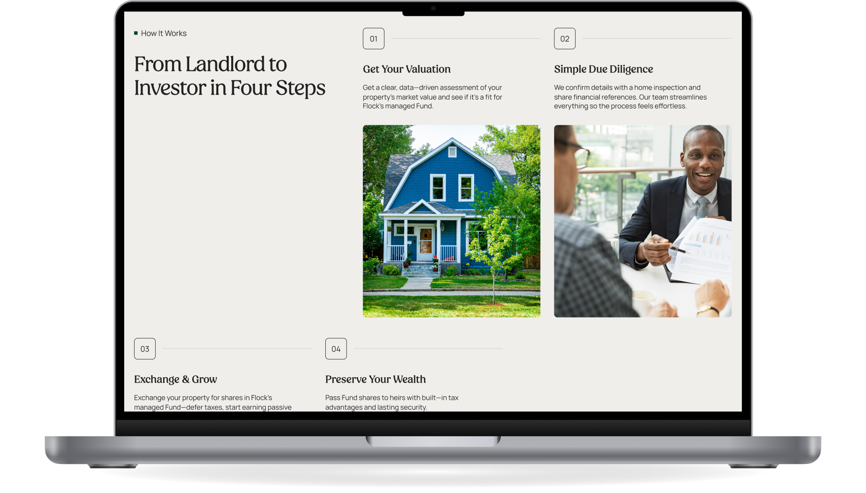 Flock Homes offers a tax-deferred exit for landlords by converting single-family rentals into shares of a diversified, professionally managed real estate fund through a 721 Exchange. Owners keep their equity, defer capital gains taxes, and continue earning real-estate income—without the hassles of landlording. Brickell Digital partnered with Flock to reimagine its digital presence, building a brand system and narrative that make complex financial mechanics feel simple, credible, and human.