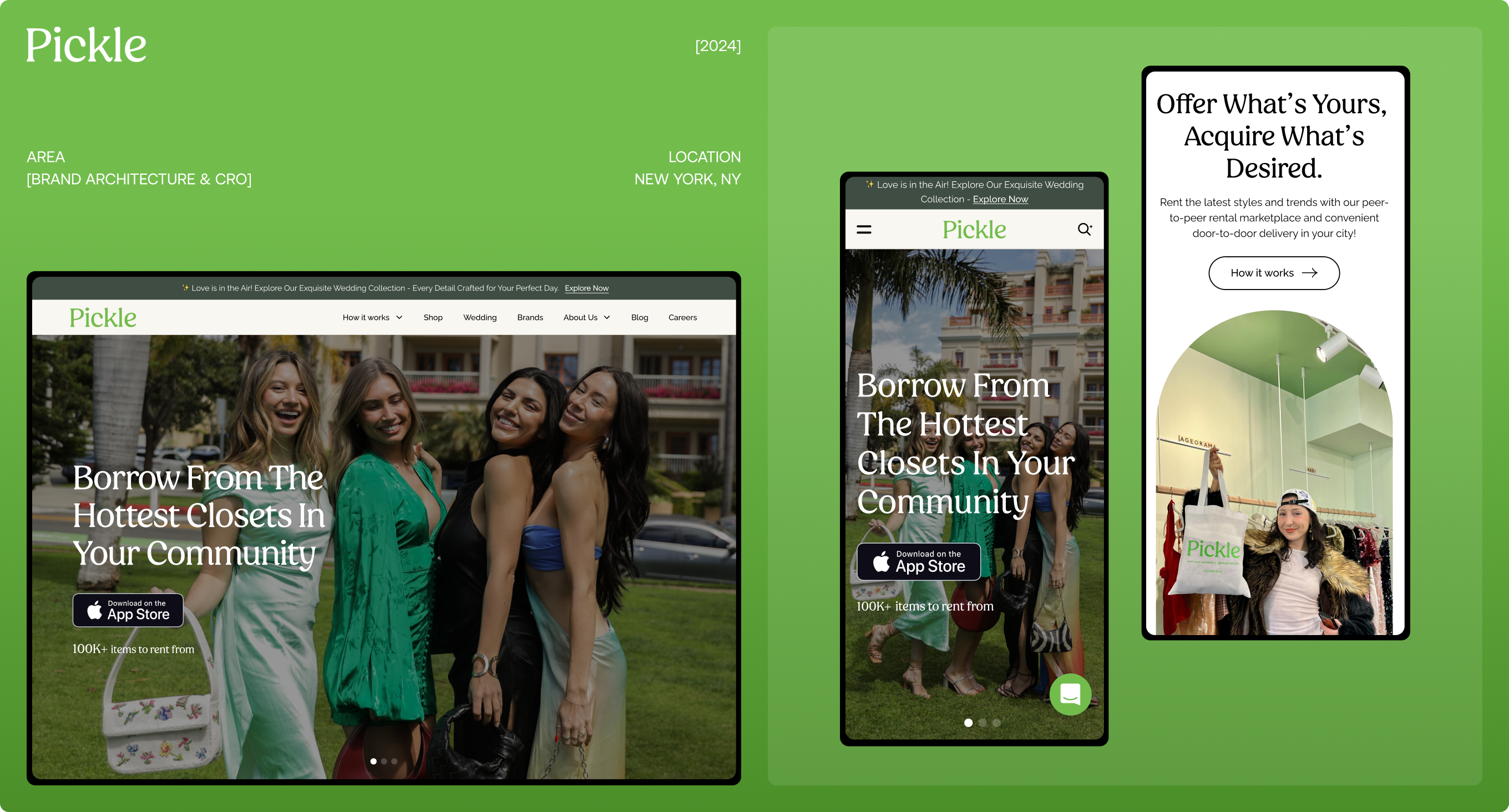 Pickle is a transformative peer-to-peer rental marketplace that began with a bold idea for sustainability and mindful consumption. Brickell Digital was tasked with rethinking the brand architecture of the website and optimizing their website for app downloads.