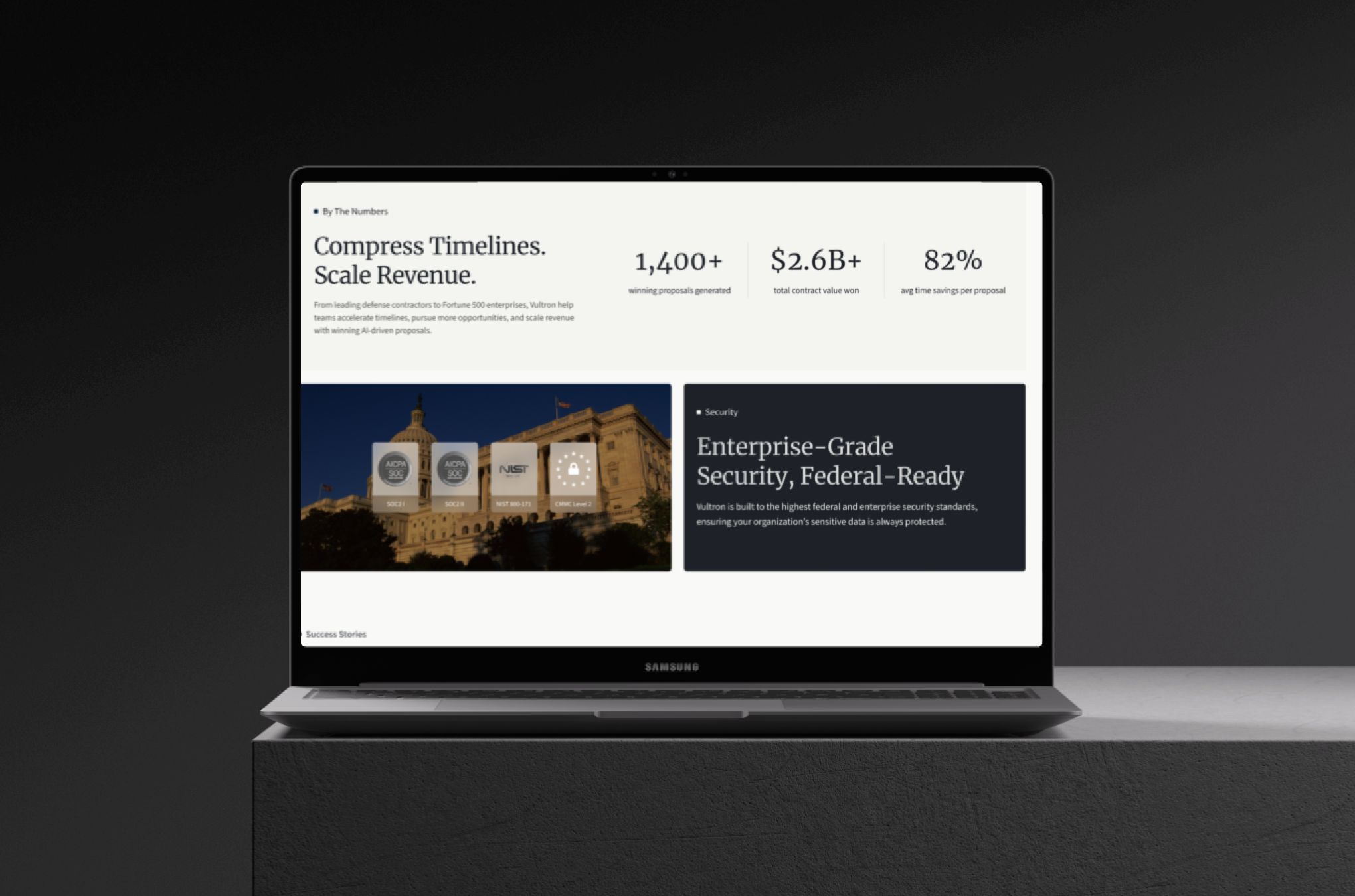 Vultron transitioned from a niche AI tool to a complete proposal intelligence platform. We refined its tone, UI, and messaging to resonate with decision-makers, proposal teams, and federal contractors alike — blending SaaS-style clarity with government-grade credibility. Our modular system now supports ongoing growth across Vultron’s ecosystem: web, product, conference collateral, and marketing automation — ensuring every touchpoint reinforces one idea: intelligence that wins.