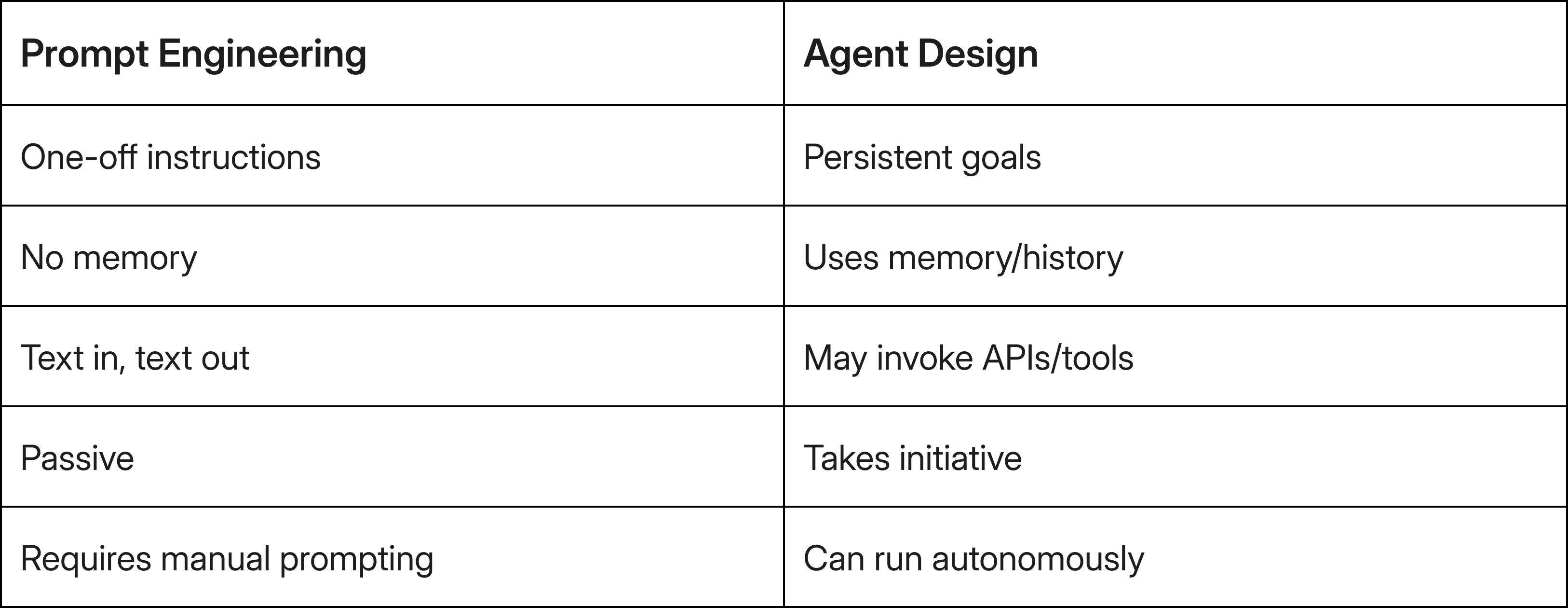 Prompt engineering is about instructing a model in natural language. Agent design is about orchestrating behavior — thinking in terms of inputs, memory, tools, logic, and goals.